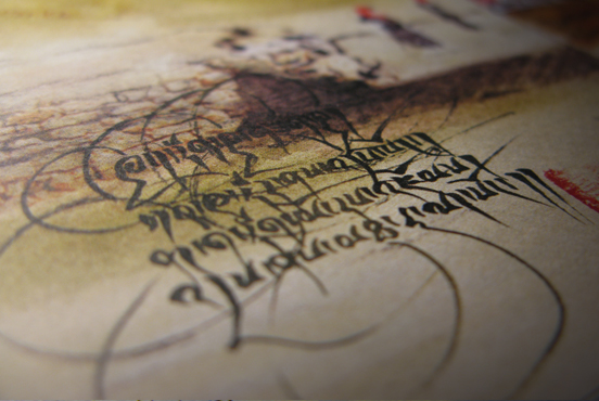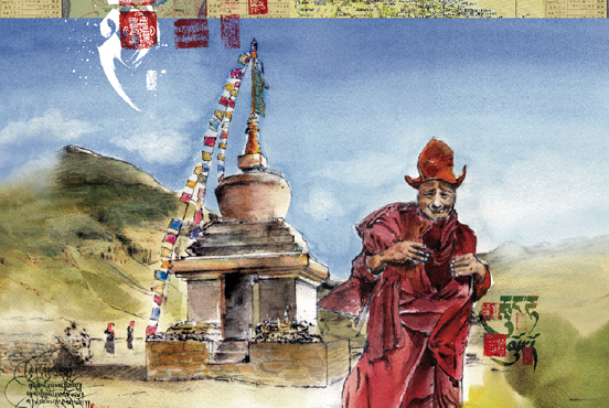 Conception graphique d'un dépliant spécial Tibet oriental pour envoi postal massif. Travail particulier sur la typographie manuscrite tibétaine. Réalisation d'une illustration à l'aquarelle à partir d'un montage de plusieurs images.