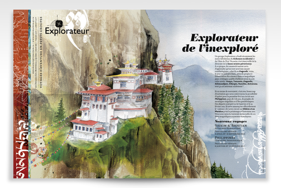 Conception graphique d'un dépliant spécial Sikkim et Bhoutan pour envoi postal massif.