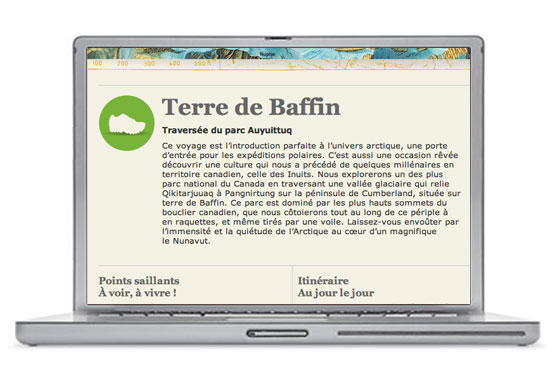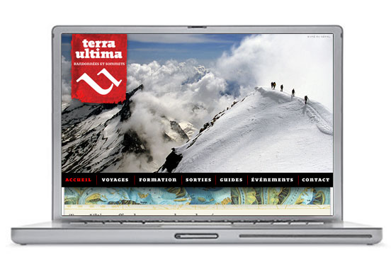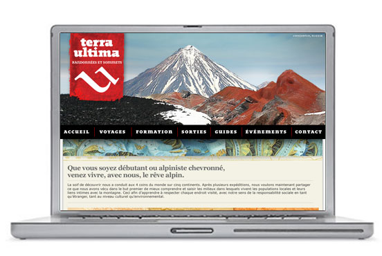 Conception graphique du site Internet de Terra Ultima, une division d'Explorateur Voyages offrant des voyages de randonnée et de haute montagne : Terre de Baffin, Manaslu, GR20 Corse et autres destinations à faire rêver tout randonneur. Le site est soutenu par un système de gestion de contenu (CMS).