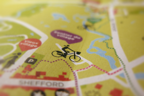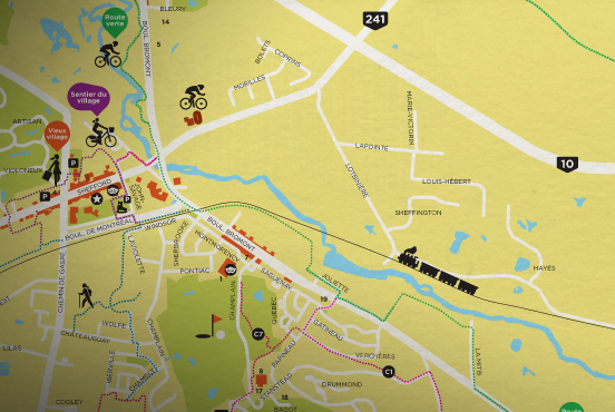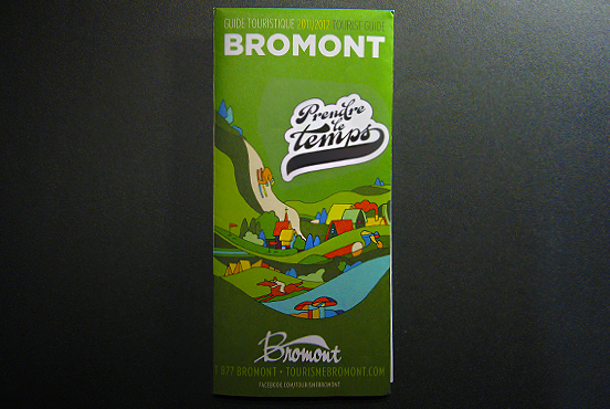 Conception graphique du guide touristique de Bromont, un dépliant cartographique qui varie selon les saisons.