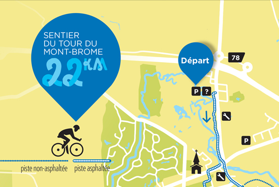 Conception graphique et illustration d'une série de cartes présentant des circuits touristiques. Non seulement ces cartes sont distribuées au bureau d'accueil touristique de Bromont mais chaque circuit est également diffusé sur Google Maps.