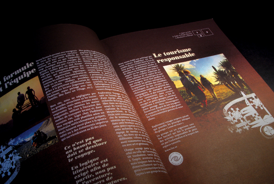 Élaboration du concept graphique du catalogue corporatif de 64 pages : recherche photo, réalisation des illustrations (aquarelle, trait et carte géographiques) et production.