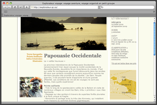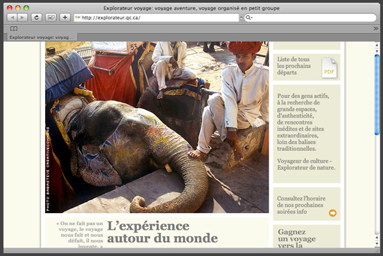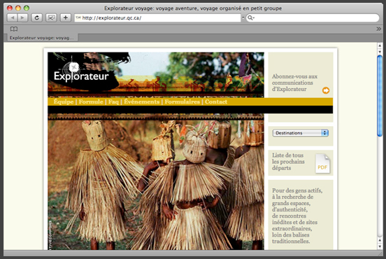 Production du site Internet d'Explorateur Voyages : design graphique, scénarisation, intégration, programmation et recherche photo.