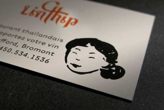 Conception graphique des cartes d'affaires du restaurant thaïlandais, rafraîchissement du logotype et création d'illustrations à l'encre de Chine.